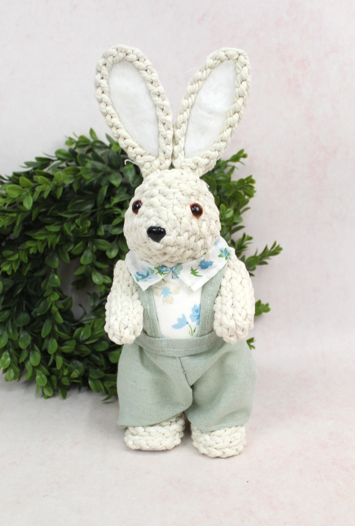 Dekoracja wielkanocna styropian-sznurek pleciony ZAJAC w ogrodniczkach 34x13x12 cm biały