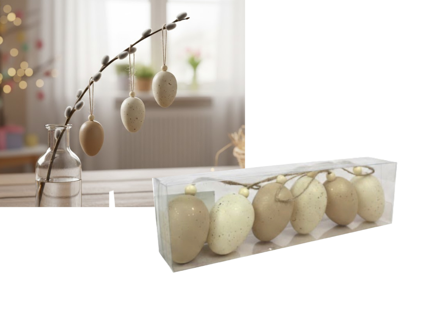 Dekoracja zawieszka wielkanocna JAJKO 6 cm  w tubie białe, beżowe, brązowe KWIATKI ZAJĄCZKI kpl. 6 szt