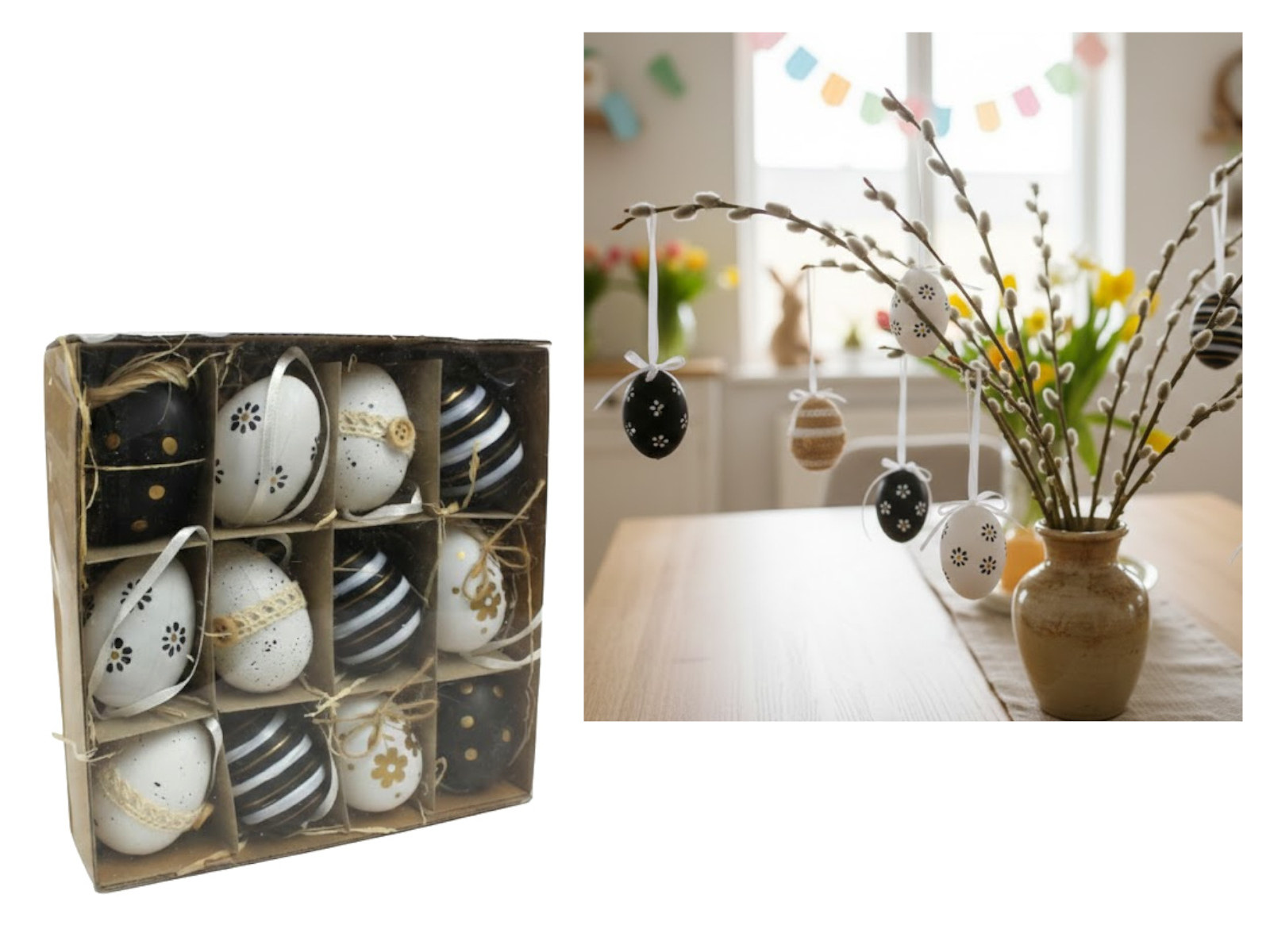 Dekoracja zawieszka wielkanocna JAJKO 6 cm  w kartonie białe, czarne PASY, KWIATY, KROPKI kpl. 12 szt