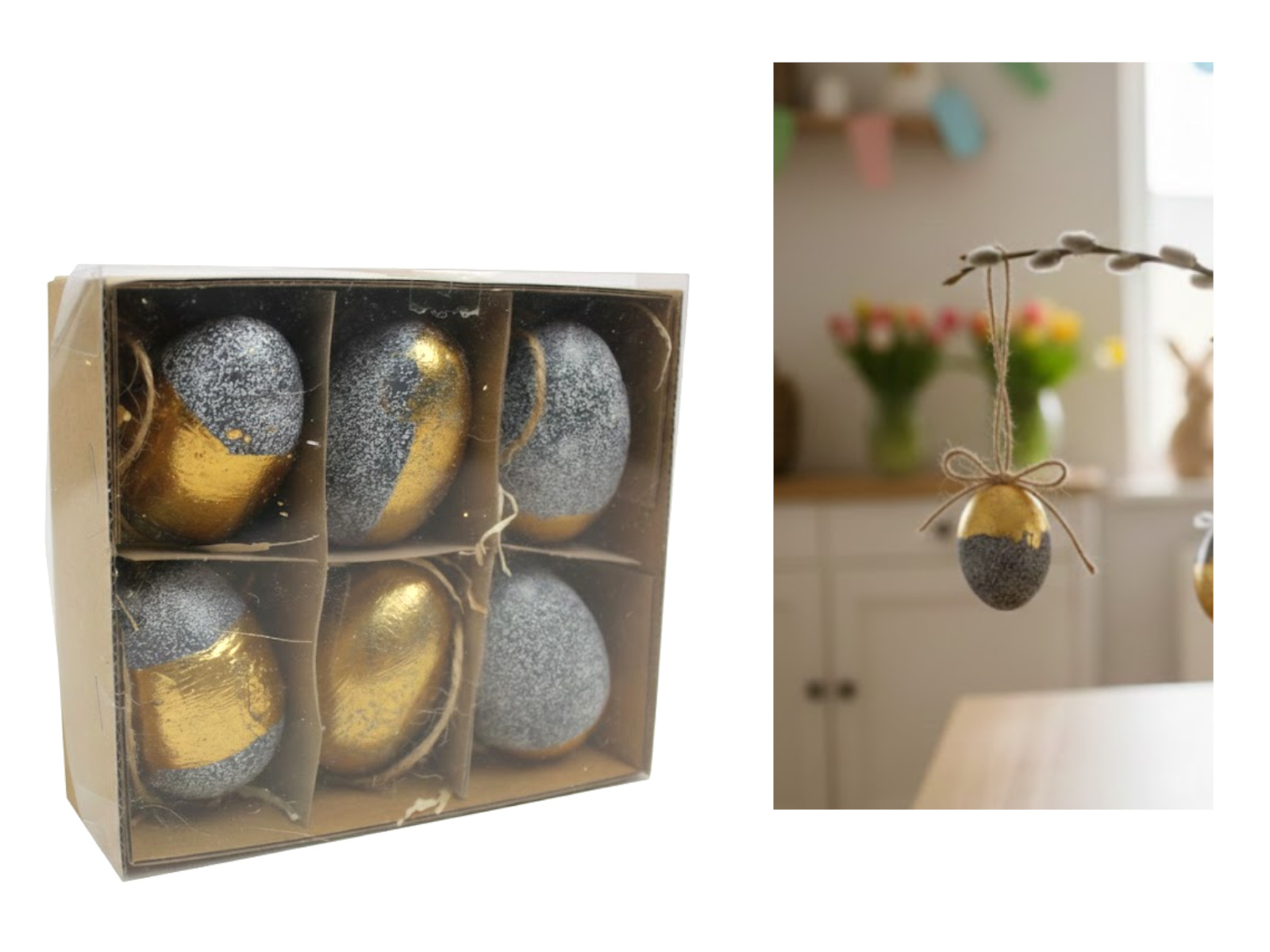 Dekoracja zawieszka wielkanocna JAJKO 6 cm  w kartonie biało-szare ZŁOTY PAS kpl. 6 szt