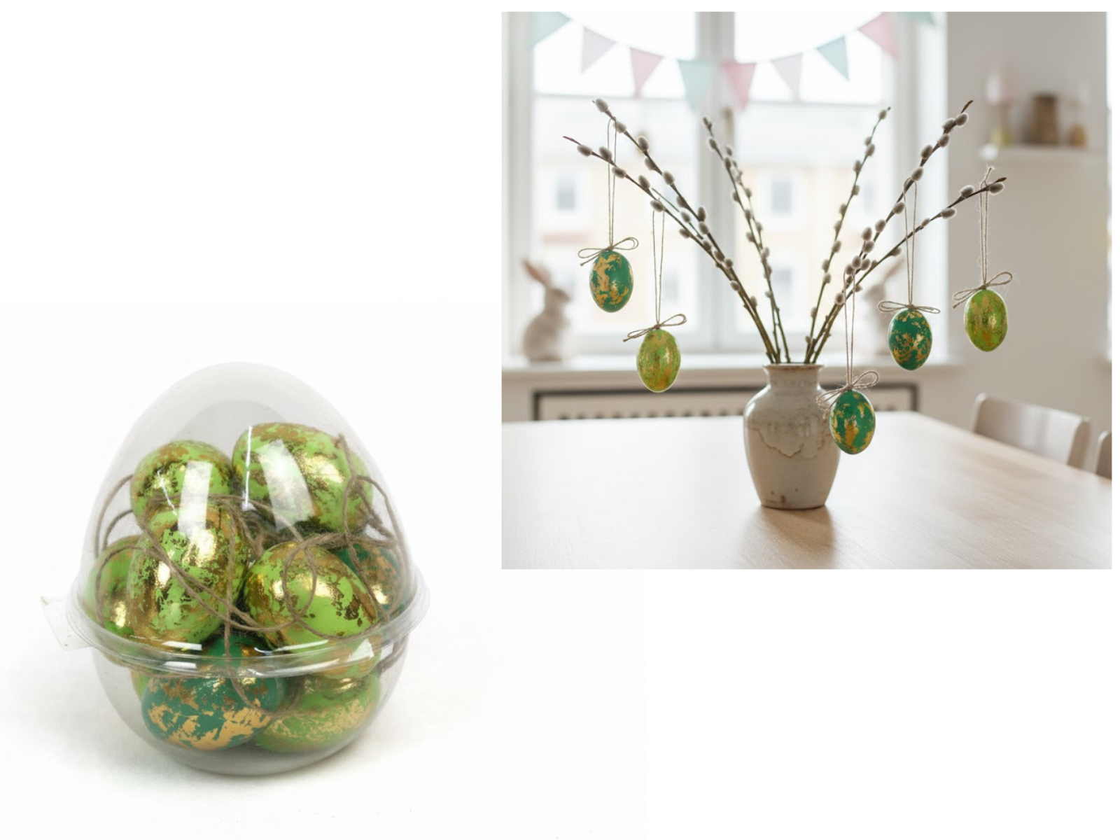 Dekoracja zawieszka wielkanocna JAJKO 6 cm w plastikowym pudełku zielone, pistacjowe POZŁACANE kpl. 12 szt
