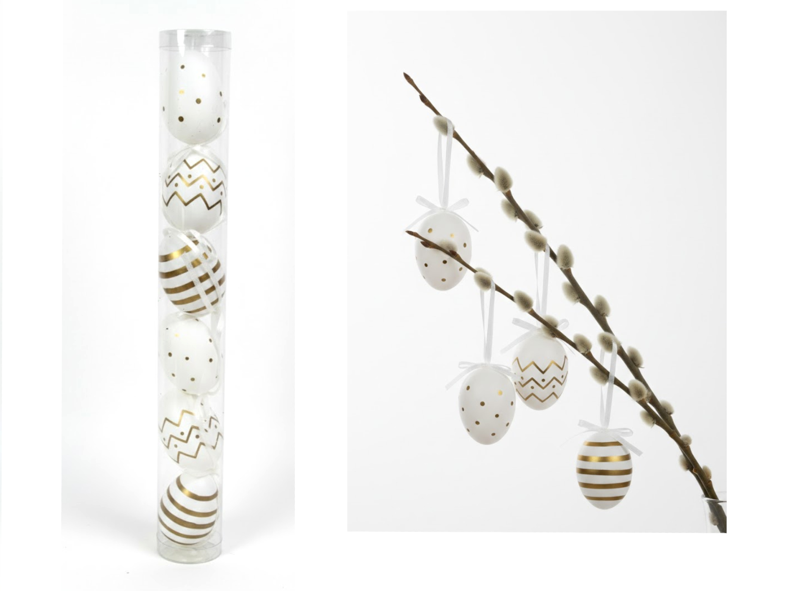 Dekoracja zawieszka wielkanocna JAJKO 6 cm w tubie białe ZŁOTY WZÓR kpl. 6 szt