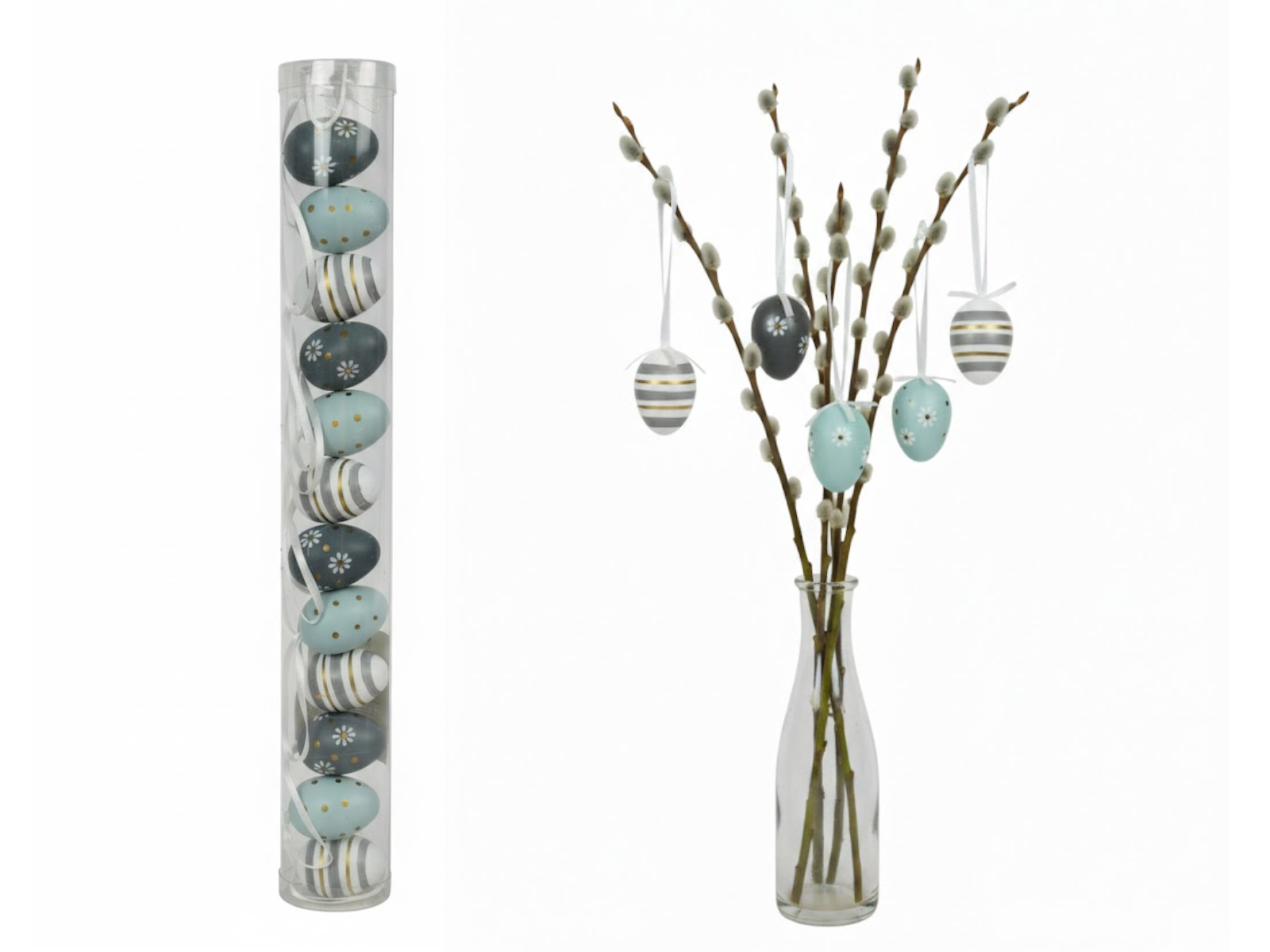 Dekoracja zawieszka wielkanocna JAJKO 4 cm w tubie białe, błękitne, szare KWIATY PASY kpl. 12 szt