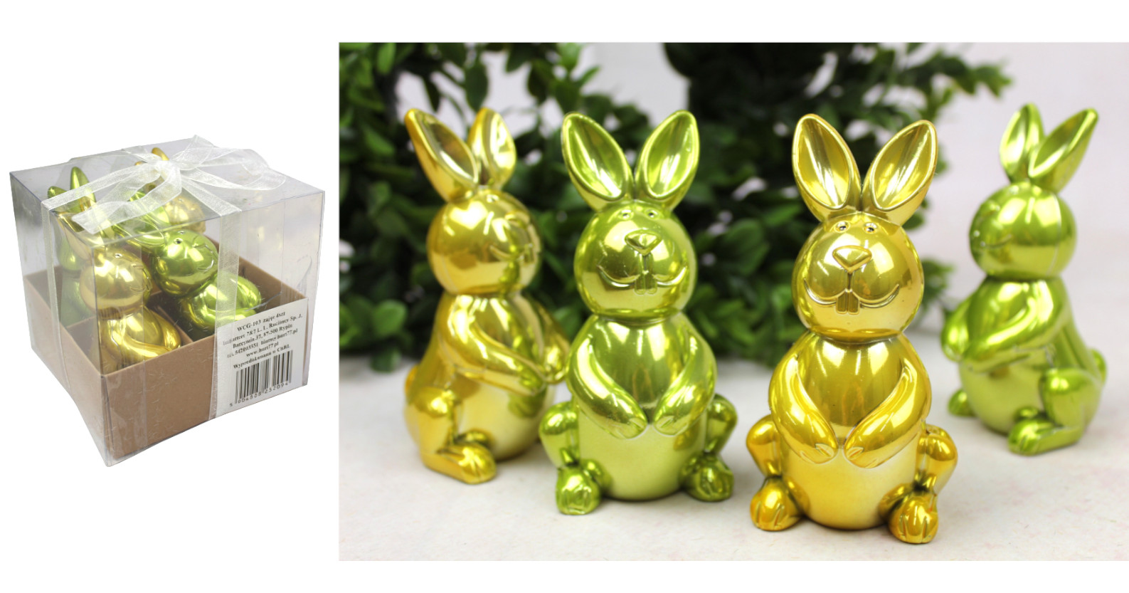 Dekoracja wielkanocna plastikowy ZAJĄC 10x5,5x5 cm ZIELONY, ŻÓŁTY metalizowany kpl. 4 szt