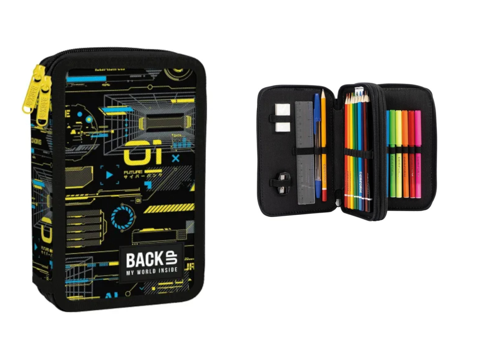 Piórnik z wyposażeniem podwójny 20x13x5 cm BACKUP 7 MODEL DW50 czarny z wzorem