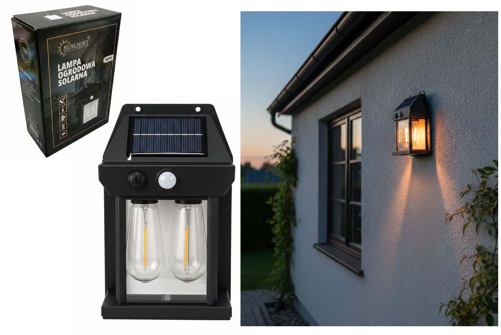 Lampa solarna ogrodowa LED naścienna, kinkiet DWIE ŻARÓWKI światło ciepłe 15x10x5 cm - 1 szt