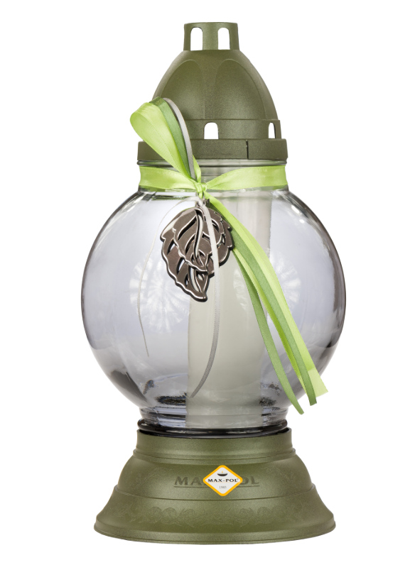 Znicz szklany 958 GŁADKI dymiony z wstążką OLIWKOWY Liść grafit 33 cm - 1 szt