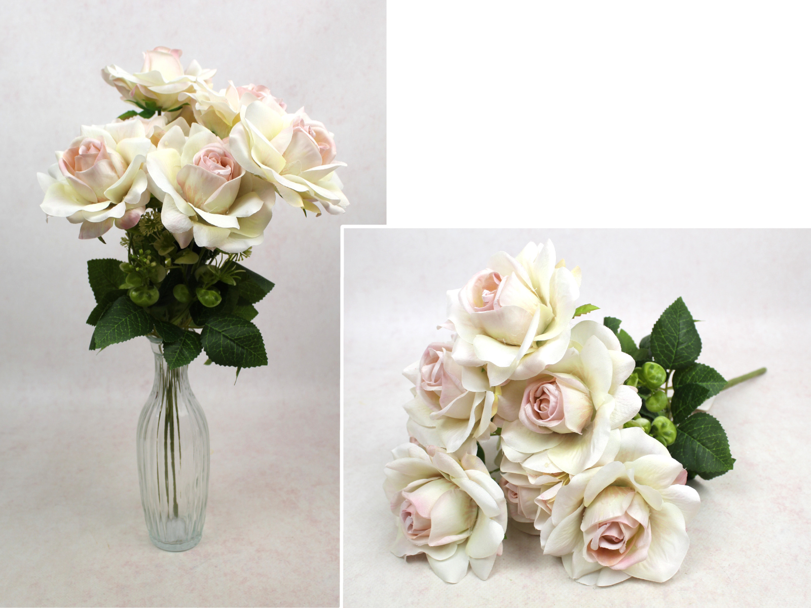 Kwiat RÓŻA wys. 48 cm, 7 łodyg (7 kwiatów 12x6 cm) MLECZNO-RÓŻOWA