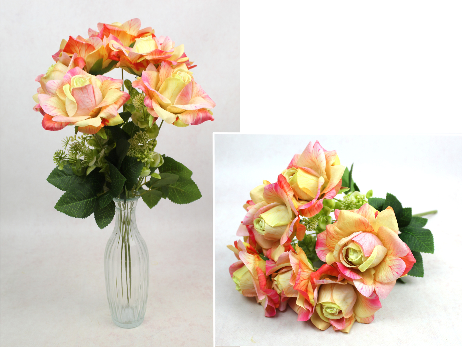 Kwiat RÓŻA wys. 48 cm, 7 łodyg (7 kwiatów 12x6 cm) RÓŻOWO-ŻÓŁTA cieniowana