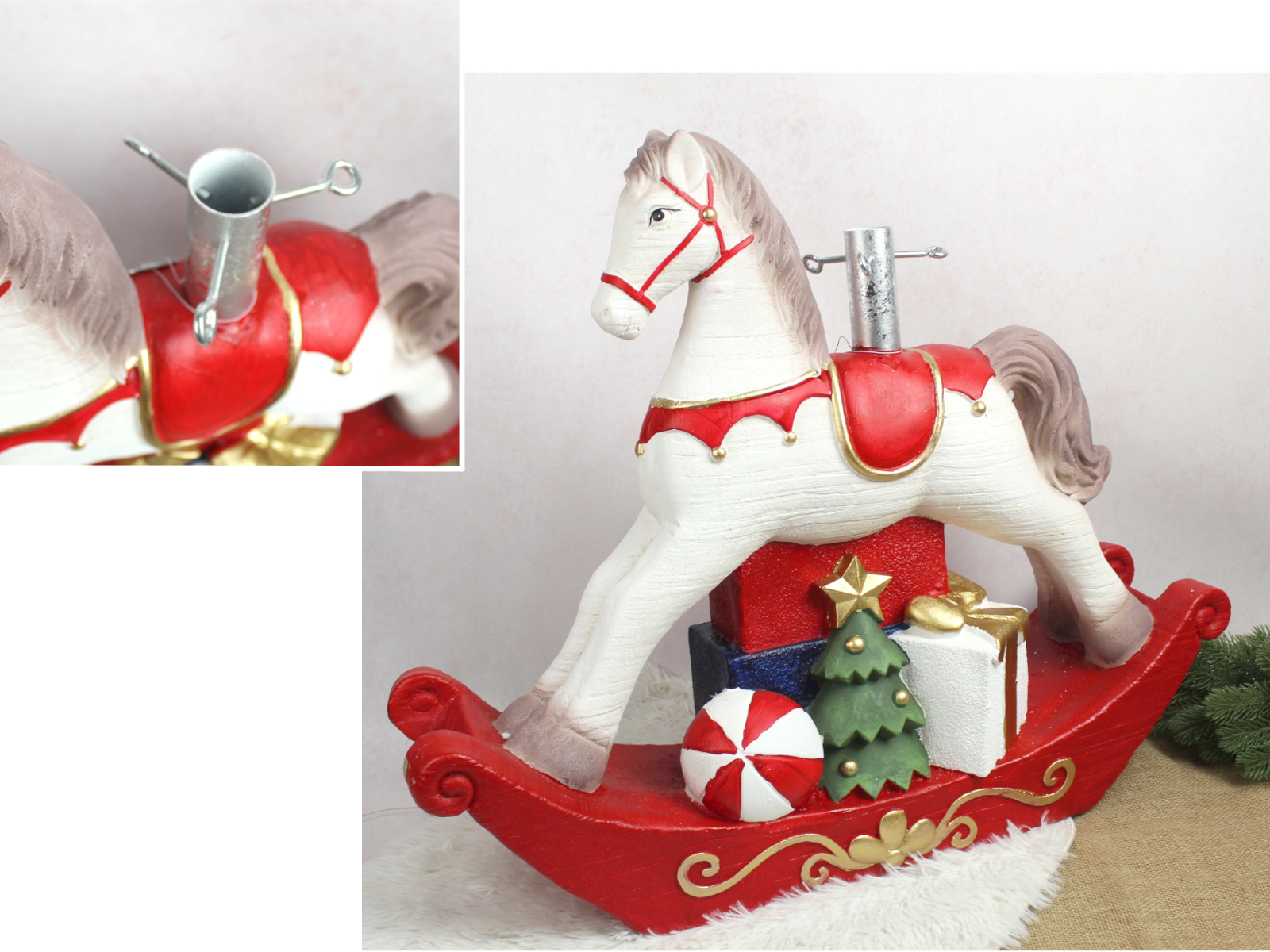 Stojak pod choinkę ceramiczny KOŃ NA BIEGUNACH 73x61x17,5 cm CZERWONO BIAŁY