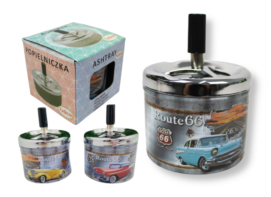 Popielniczka OBROTOWA metalowa okrągła 12x9x7 cm MIX WZORÓW RETRO AUTA