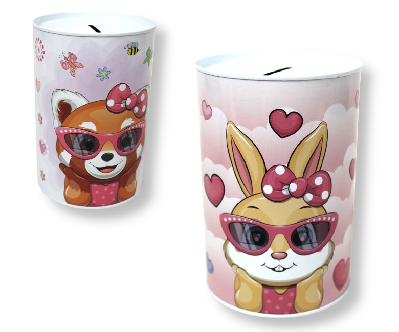 Skarbonka, puszka metalowa ZWIERZĘTA RÓŻOWE 15x10 cm MIX WZORÓW