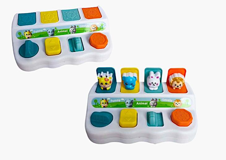 zabawka rozwija motorykę małą, koordynację ręka-oko, logiczne myślenie4 różne mechanizmy uruchamiające: przycisk, suwak, pokrętło, przełączniknie wymaga baterii