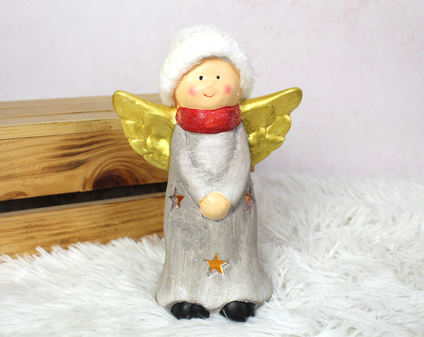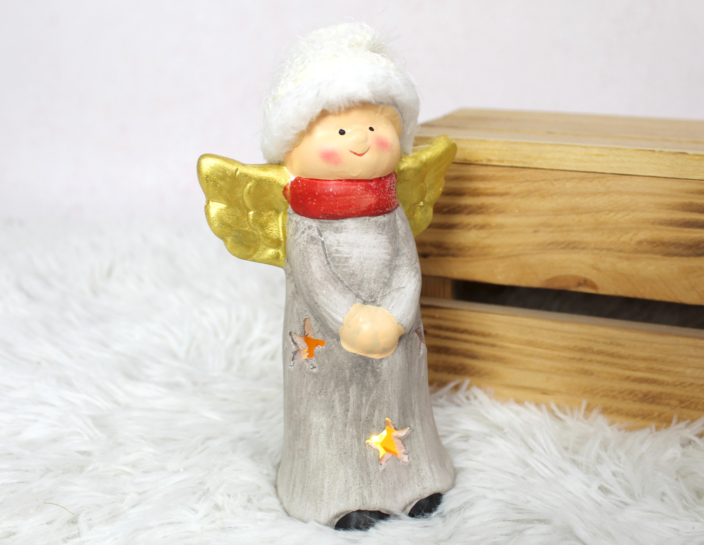 Figurka ceramiczna ANIOŁ czerwony szalik, wełniana czapka LED 20 cm 32208-1