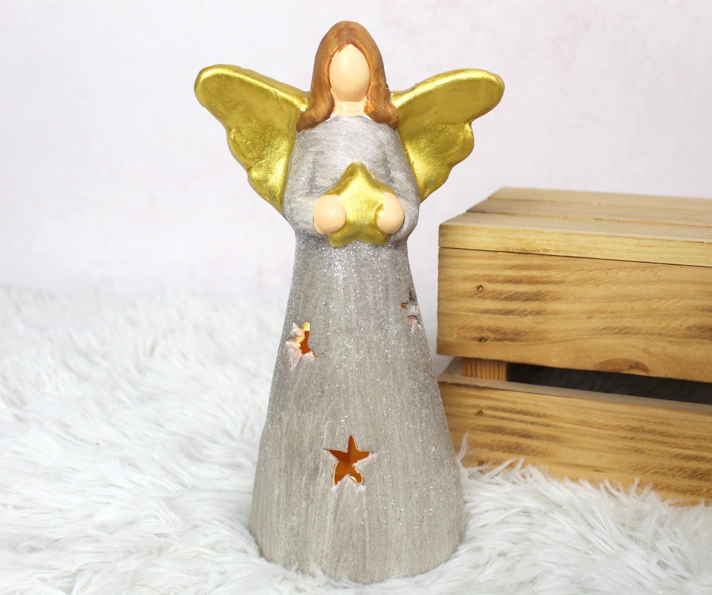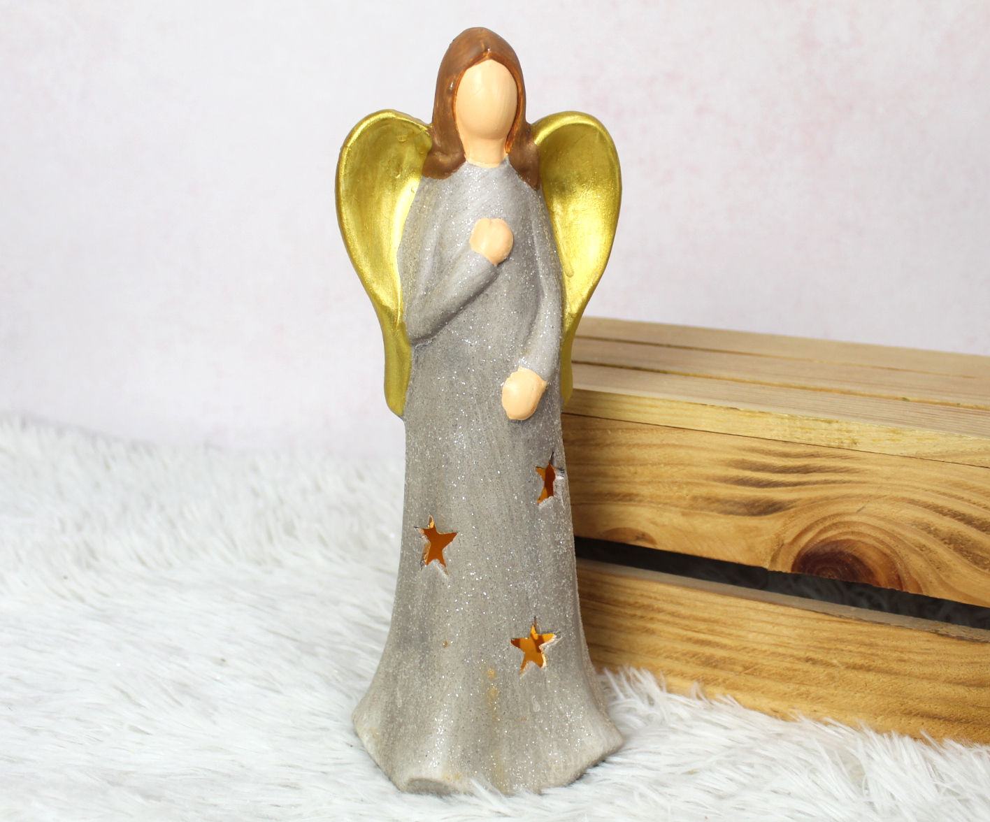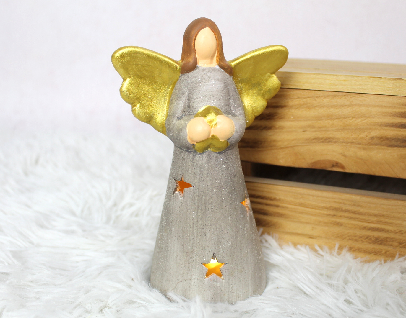 Figurka ceramiczna ANIOŁ złote skrzydła z gwiazdką LED 21 cm 32205-1