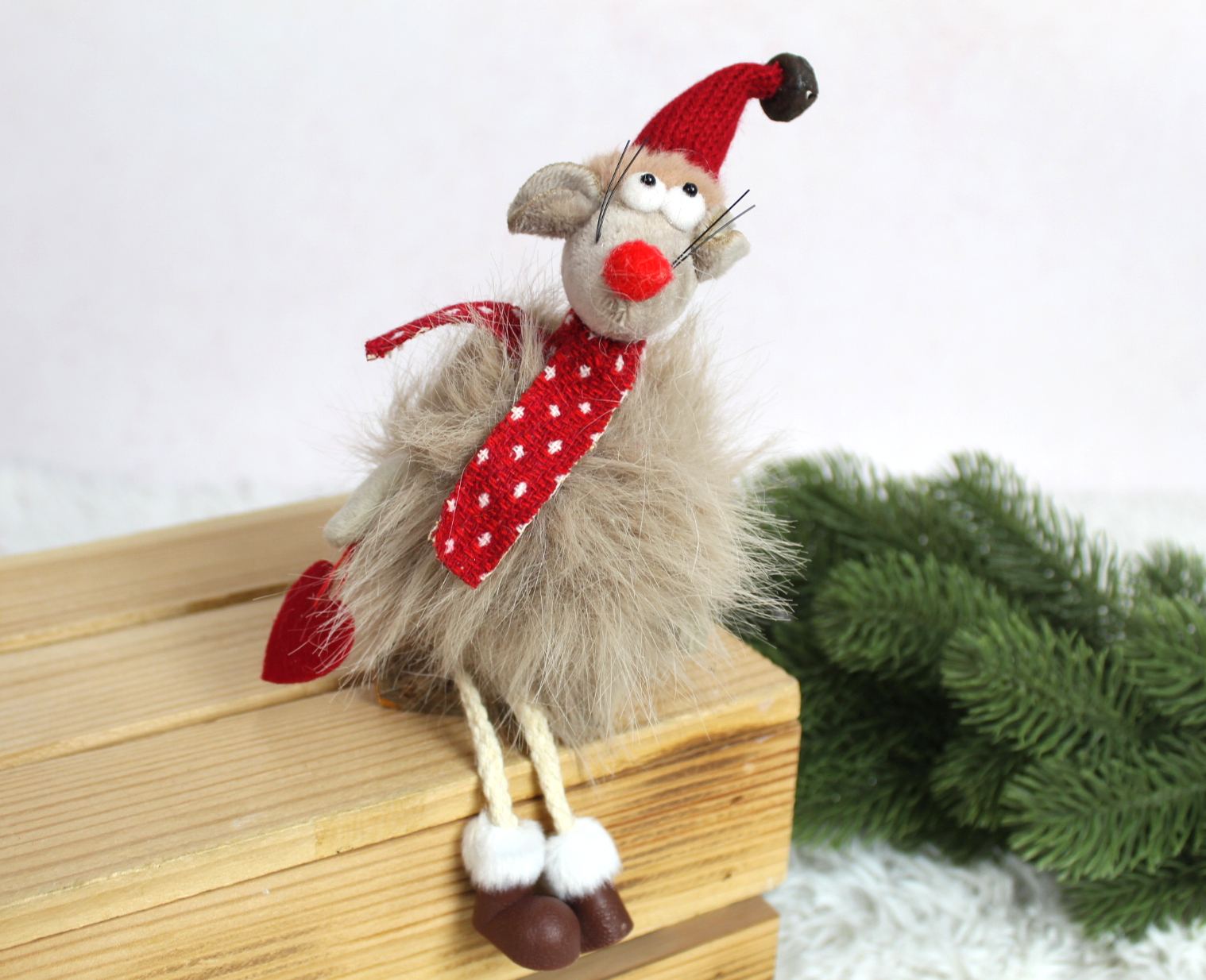 Figurka MYSZ na drewnianym podstawku 16x8x8 cm BEŻOWA z czerwonymi dodatkami