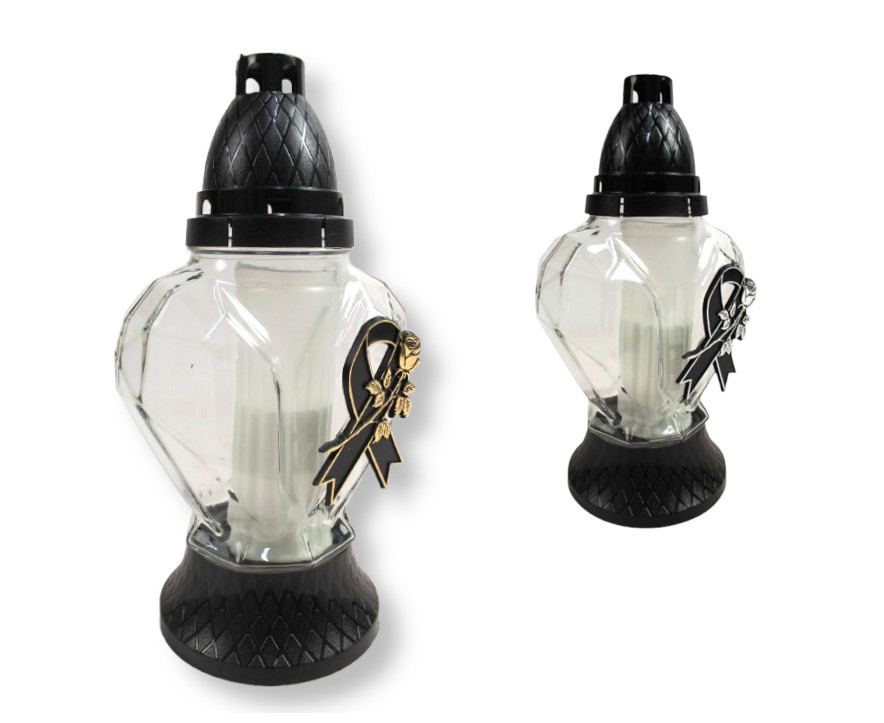 Znicz szklany Z-361 CZARNA WSTĄŻKA Z RÓŻĄ 26 cm srebrny, złoty MIX - 1 szt