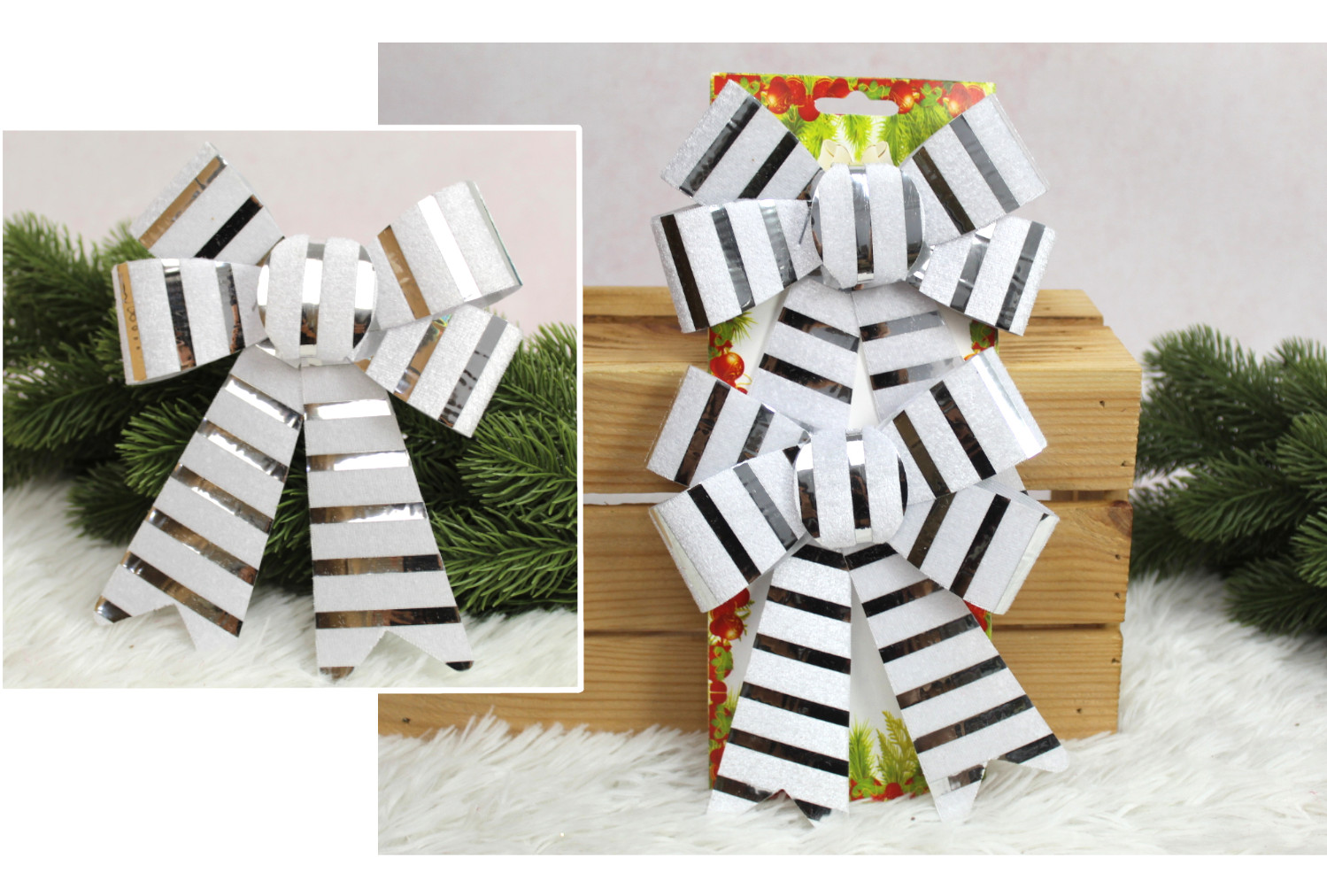 Kokardki świąteczne 18x14 cm SREBRNE w srebrne pasy kpl 2 szt