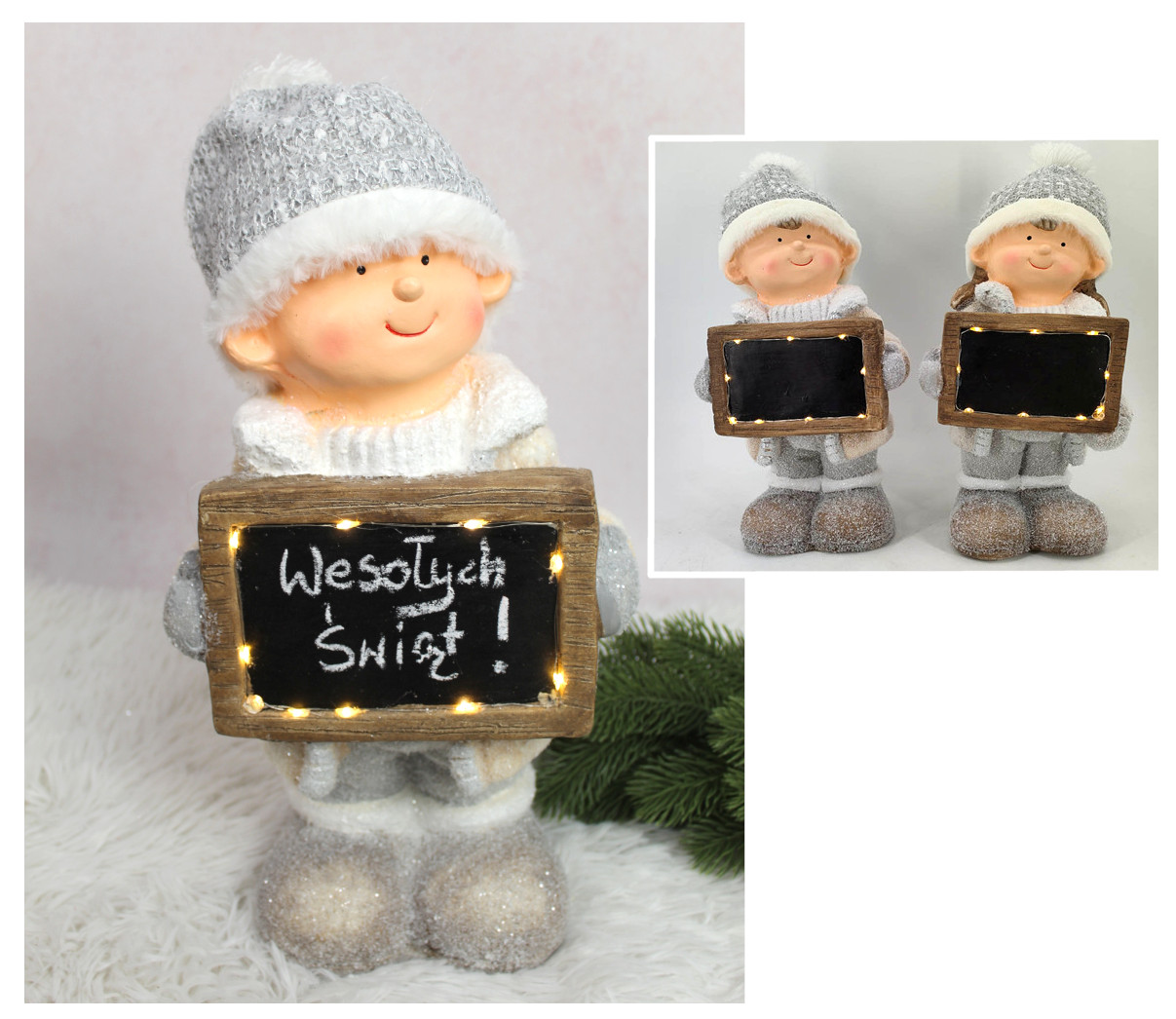 Figurka ceramiczna CHŁOPIEC, DZIEWCZYNKA z tabliczką, futrzana czapka LED 51 cm - 1 szt