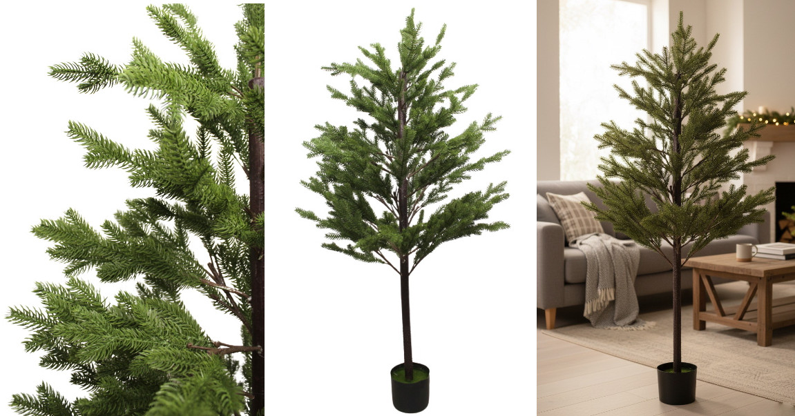 Choinka z drobnymi igiełkami i zwisającymi gałązkami.