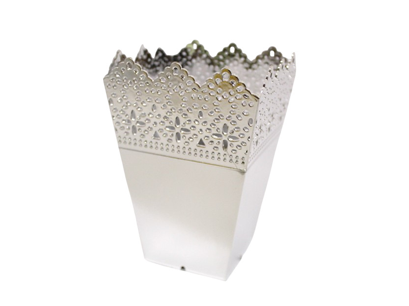 Osłonka, doniczka dekoracyjna czterokątna AŻUR SREBRNA plastik czterokątna 14x9 cm