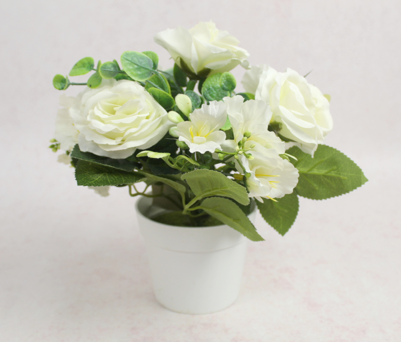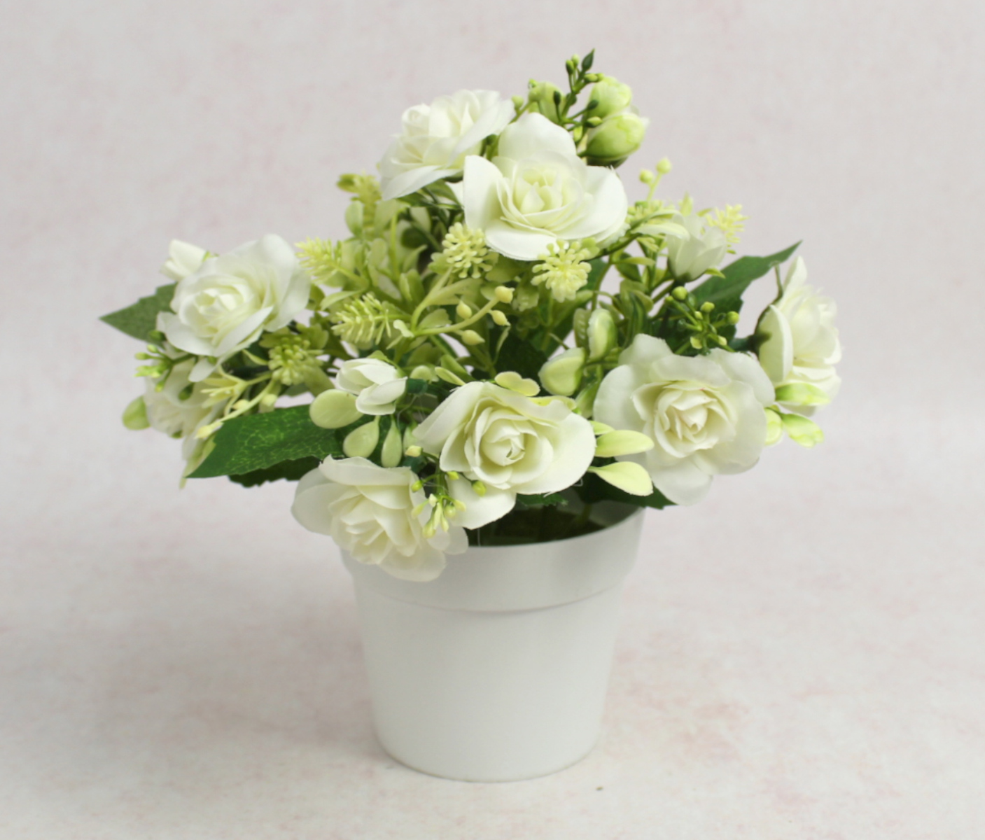 Kwiat RÓŻA w białej doniczce wys. 20 cm (kwiat 5x1,5 cm) BIAŁA