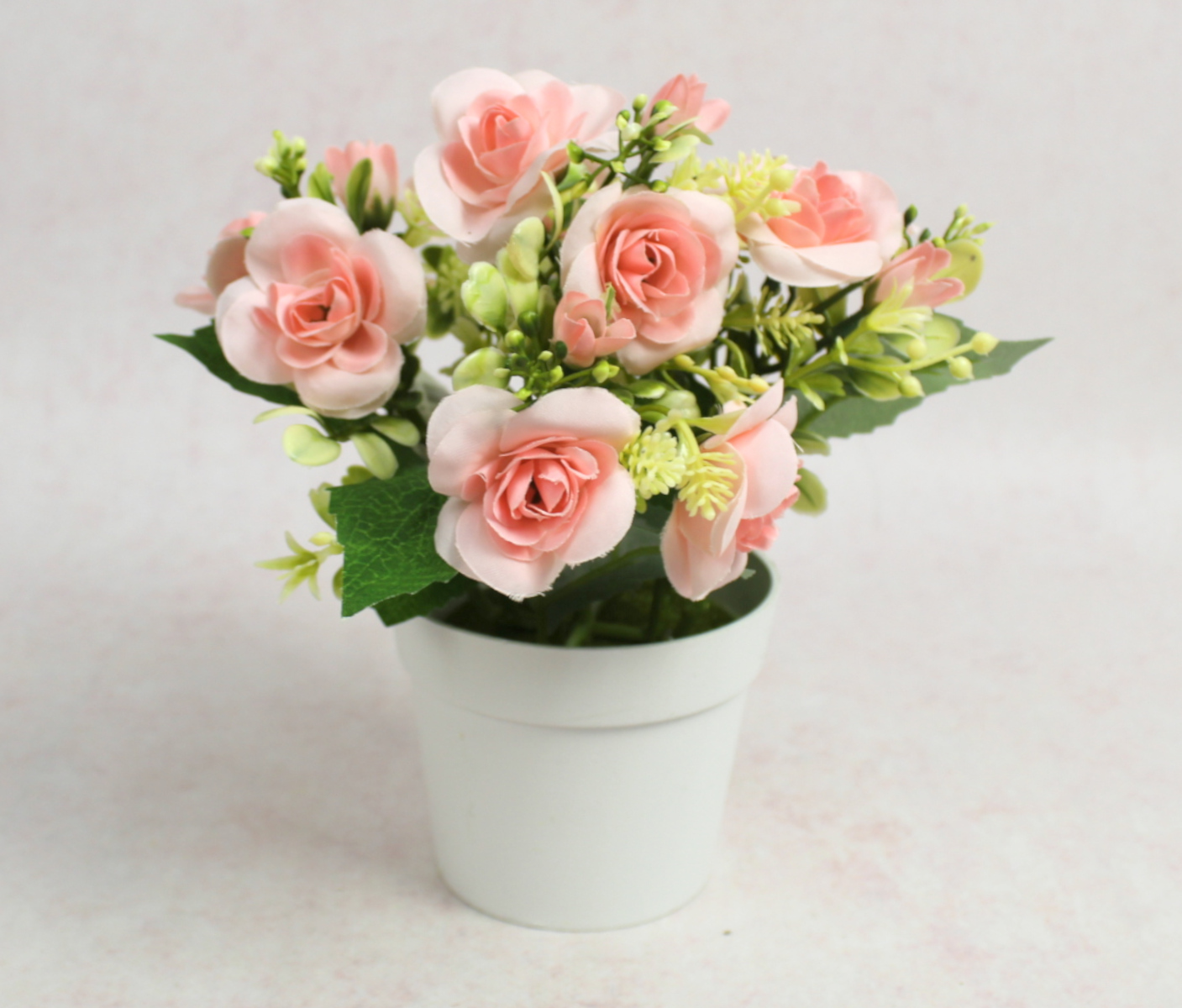 Kwiat RÓŻA w białej doniczce wys. 20 cm (kwiat 5x1,5 cm) jasno RÓŻOWA
