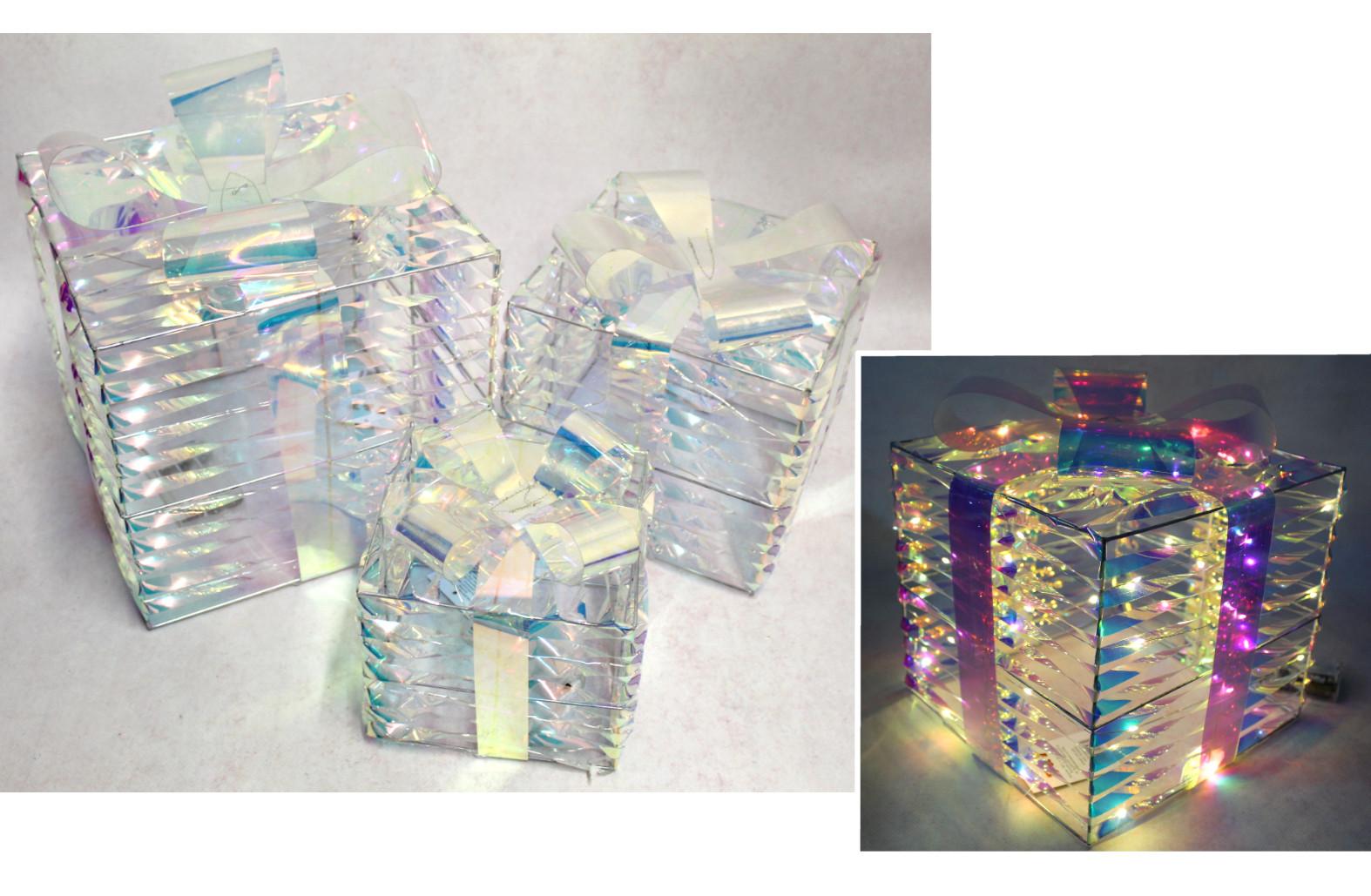 Dekoracja na stelażu z drutu z folią holograficzną PREZENT kpl 3 szt 90 LED