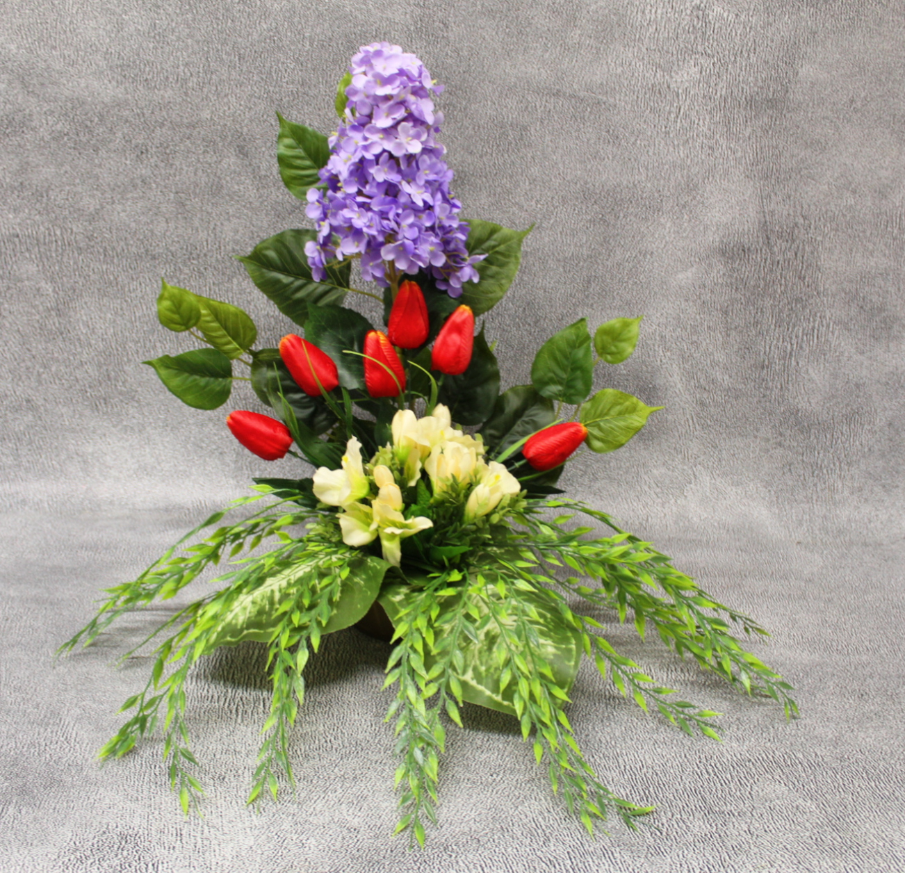 Stroik zalewany misa WIOSENNY frezje, tulipany, HORTENSJA CZERWONA (ok. 50x40x50 cm) ok. 2 kg