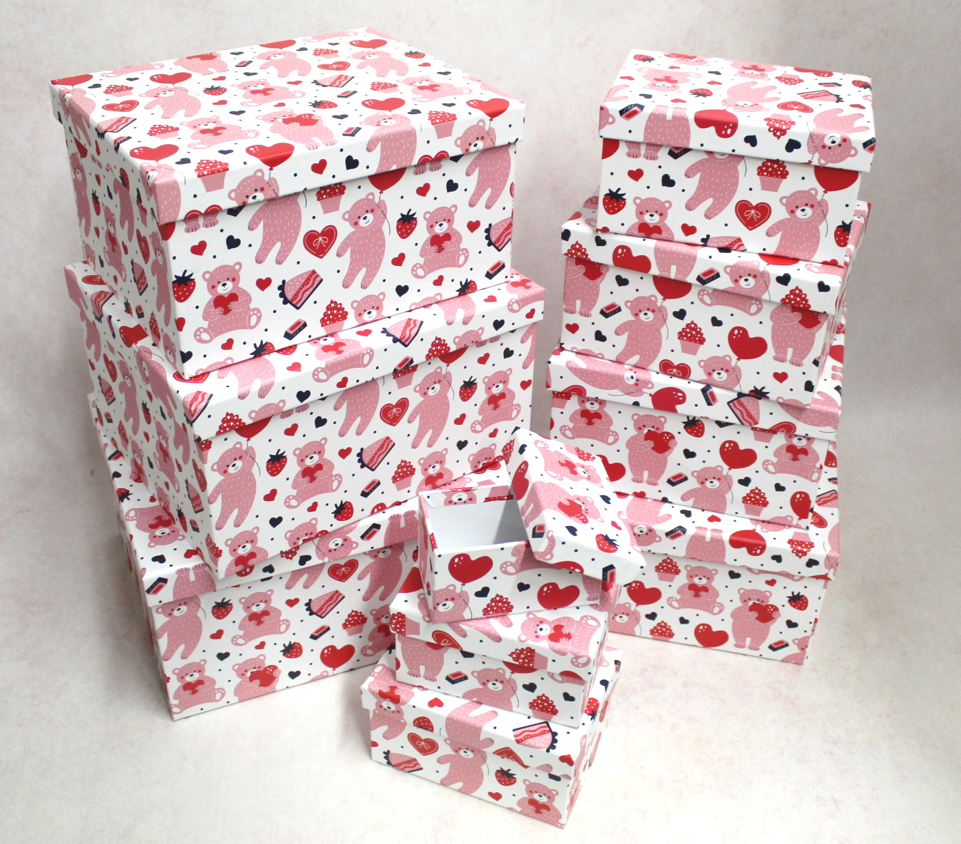 Pudełko prezentowe, kartonowe kpl 10 szt RÓŻOWY WZÓR MISIE, SERCA