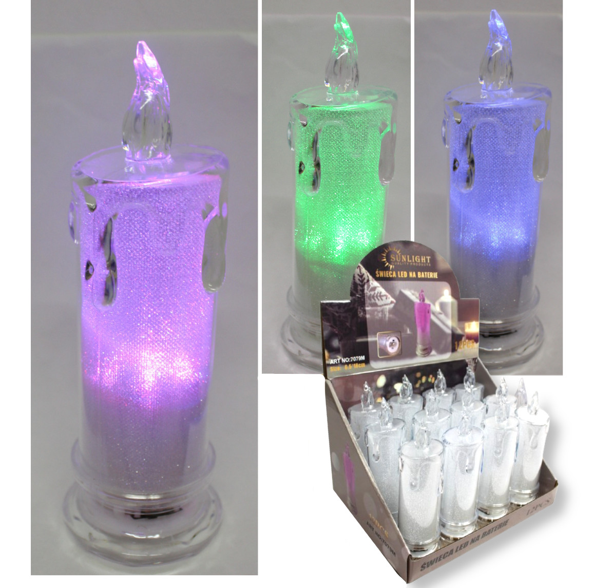 Świeca, świeczka brokatowa LED z podstawą światło RGB 18x6,5 cm TRANSPARENTNA