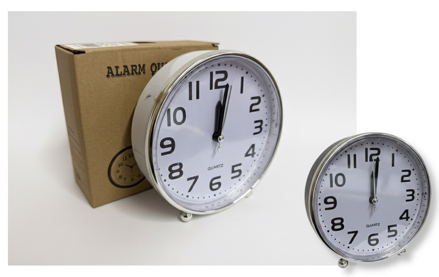 Zegar, budzik OKRĄGŁY srebrna obudowa 13x13 cm biały, czarny