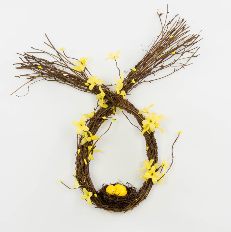 Dekoracja wielkanocna z gałązek zdobiona forsycją i gniazdkiem z pisankami 50 cm