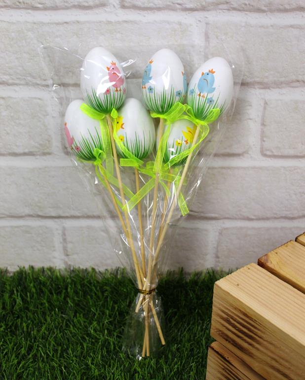 Jajka plastikowe na piku 24x4 cm białe z wzorem - kpl 6 szt