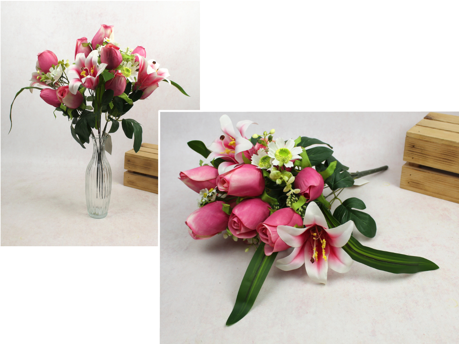 Bukiet RÓŻA, LILIA wys. 49 cm, 10 łodyg  (14 kwiatów 12-5 cm) RÓŻOWA