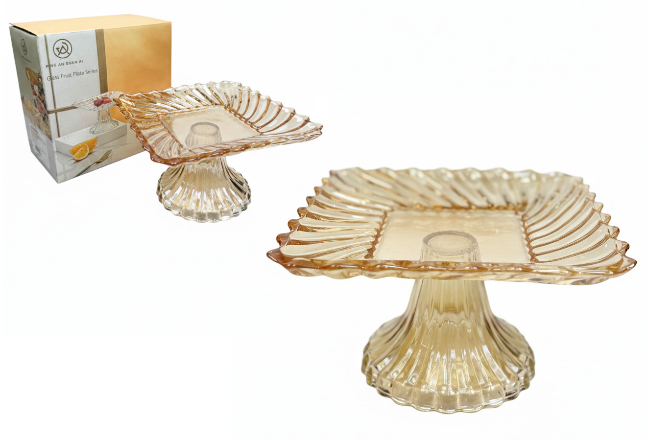 Patera szklana na nóżce kwadrat 16x10 cm w kolorze BURSZTYNU