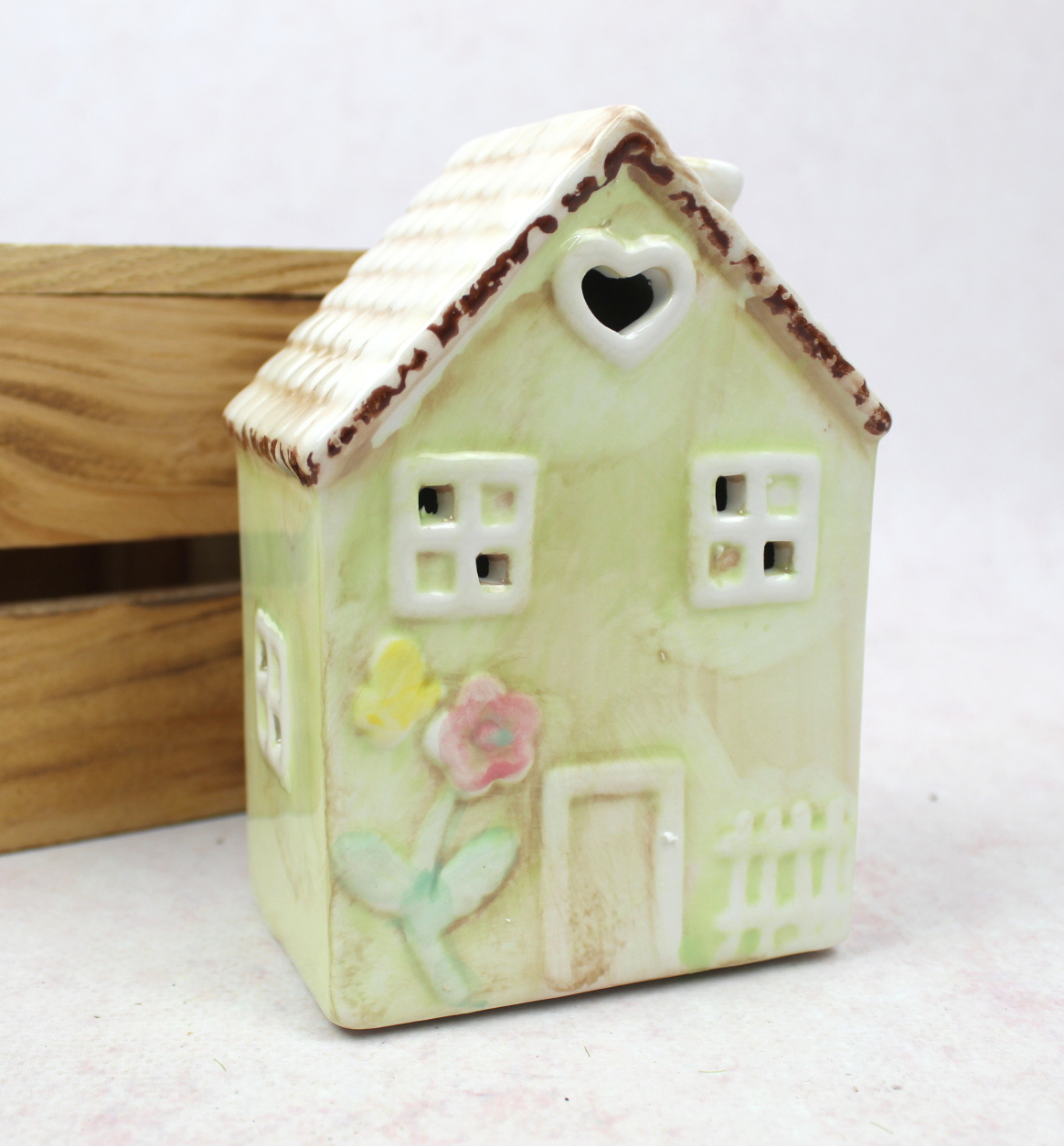 Figurka ceramiczny DOMEK led 14x10x7 cm - jasno zielony z kwiatkami