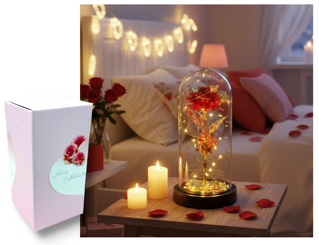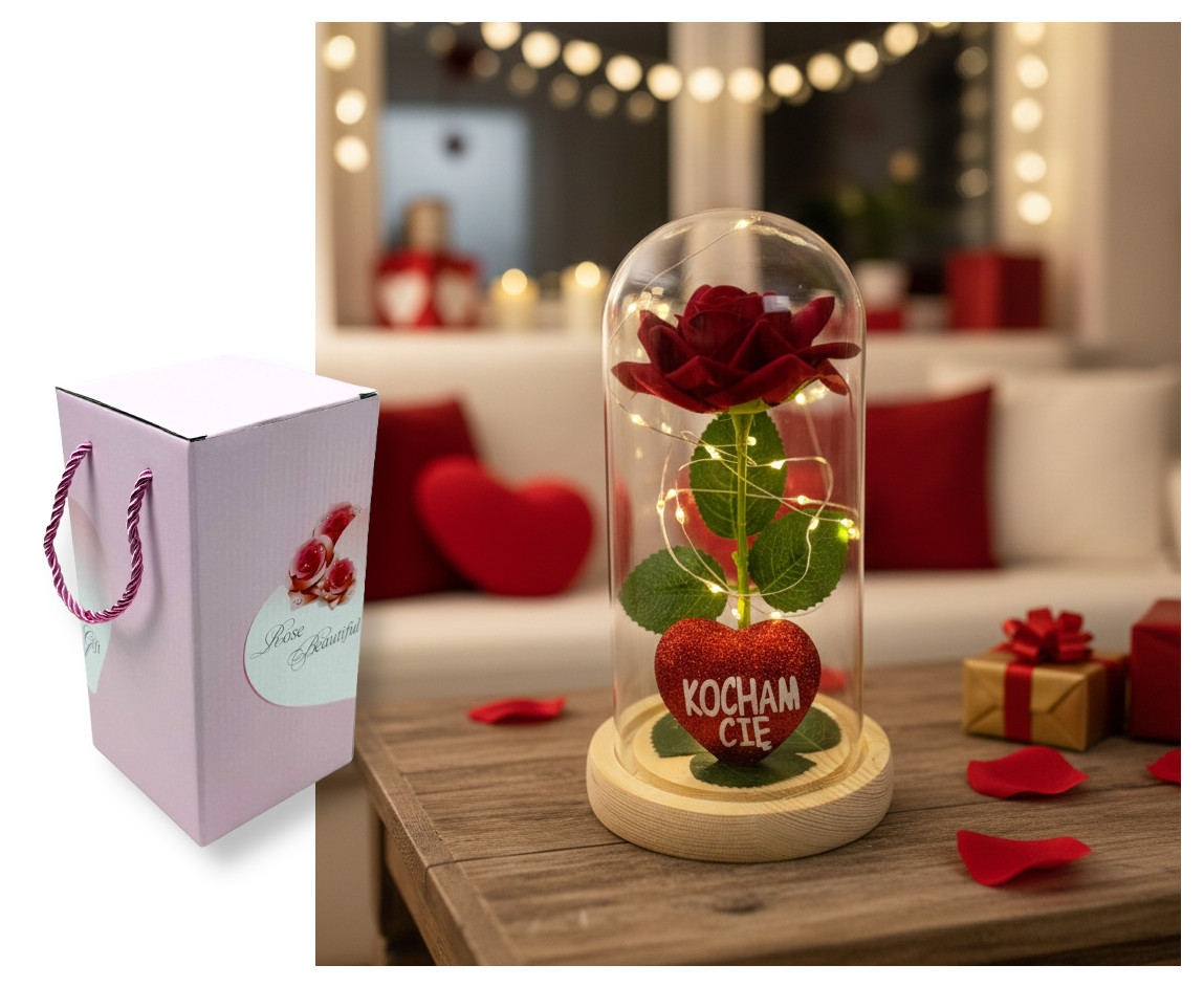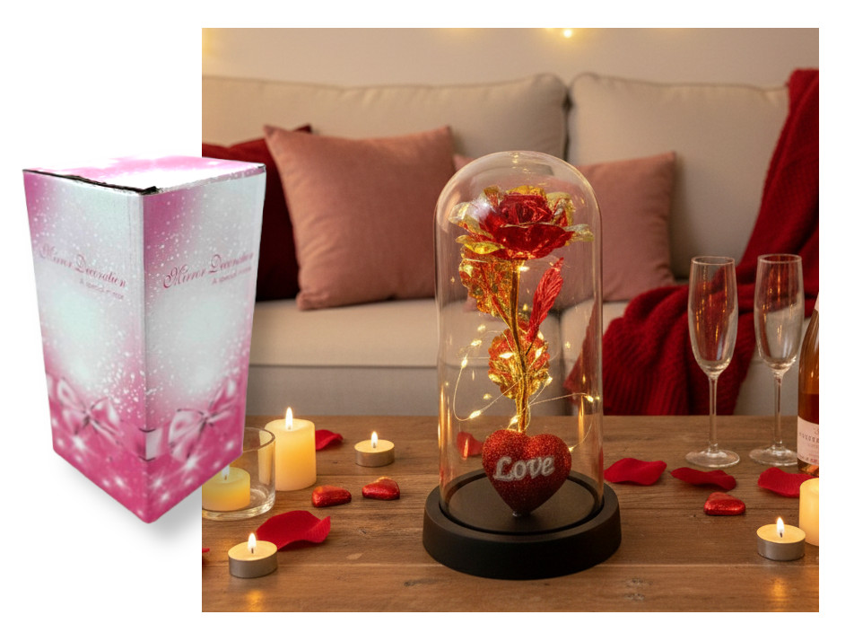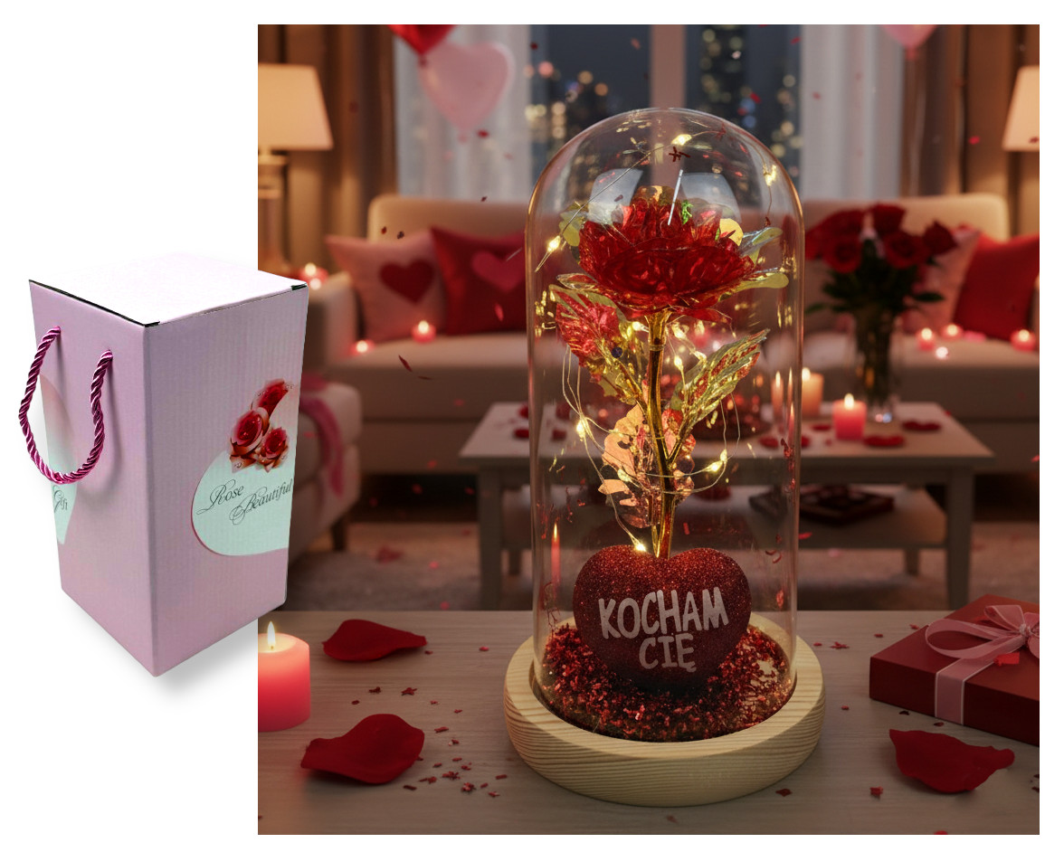 Wieczna RÓŻA LED czerwono złota na czarnym podstawku z sercem 21x11 cm