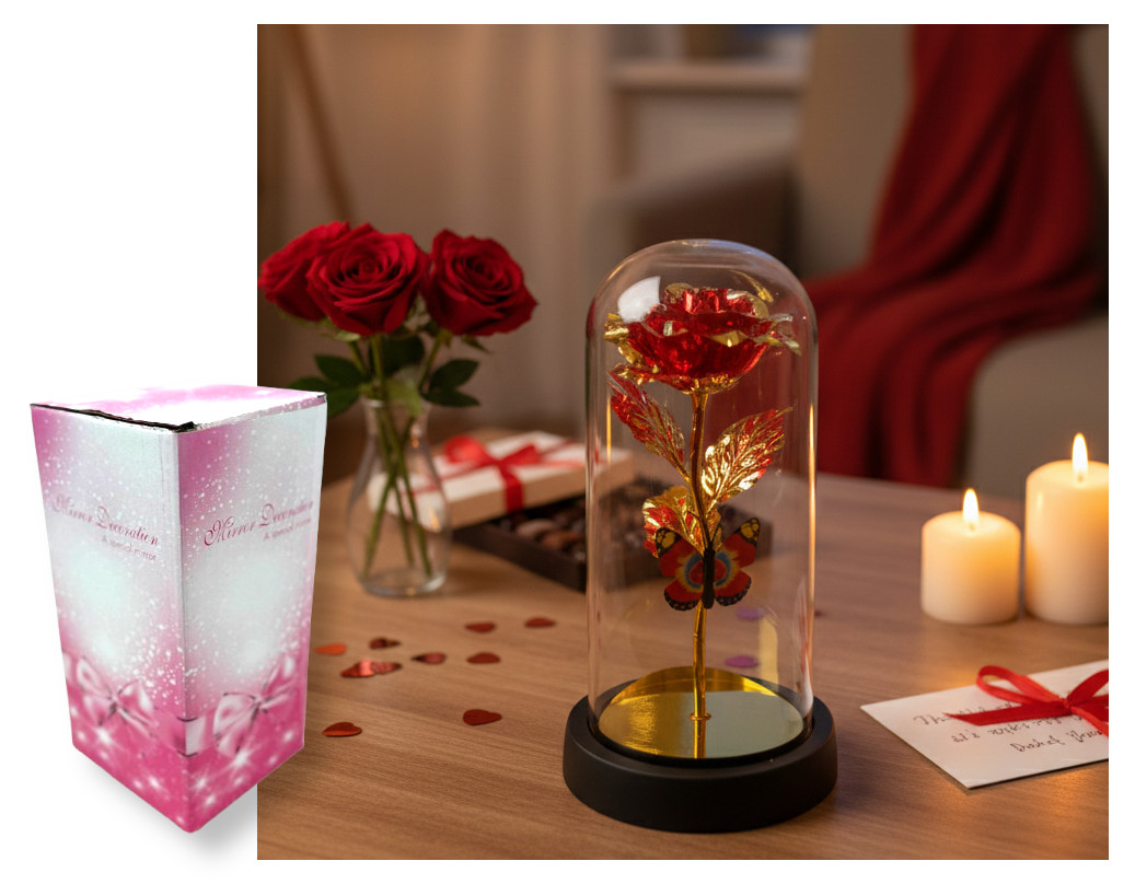 Wieczna RÓŻA LED czerwono-złota na podstawku z lusterkiem i motylem 21,5x9 cm