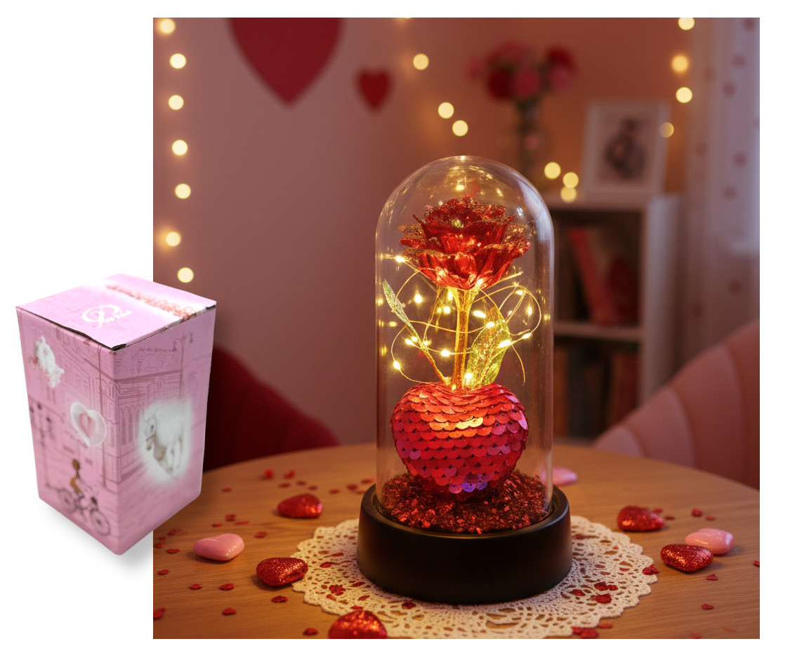 Wieczna RÓŻA LED czerwono złota z sercem na czarnym podstawku z confetti 15x8 cm
