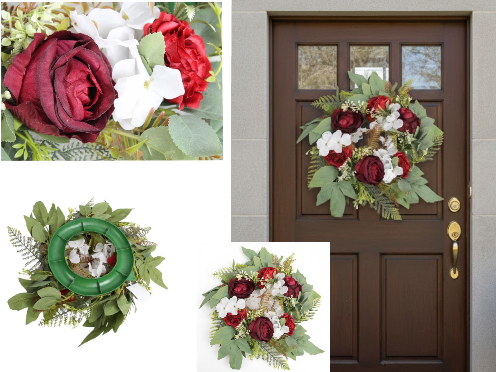 Wieniec, wianek mieszany z RÓŻĄ 43 cm, 9 kwiatów (róża 8x5 cm) - BORDOWO-BIAŁY