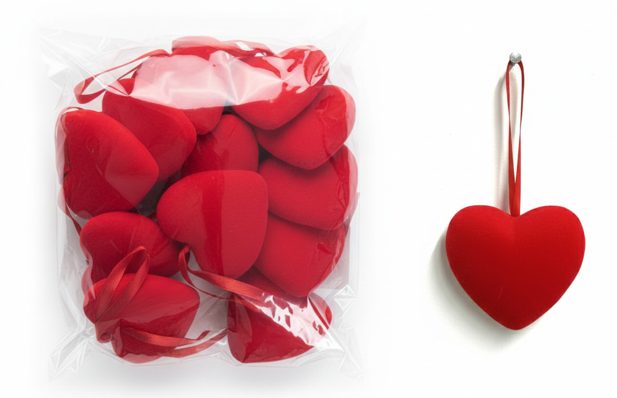 Zawieszka, ozdoba serce styropianowe flokowane 6,5 cm kpl 12 szt CZERWONE