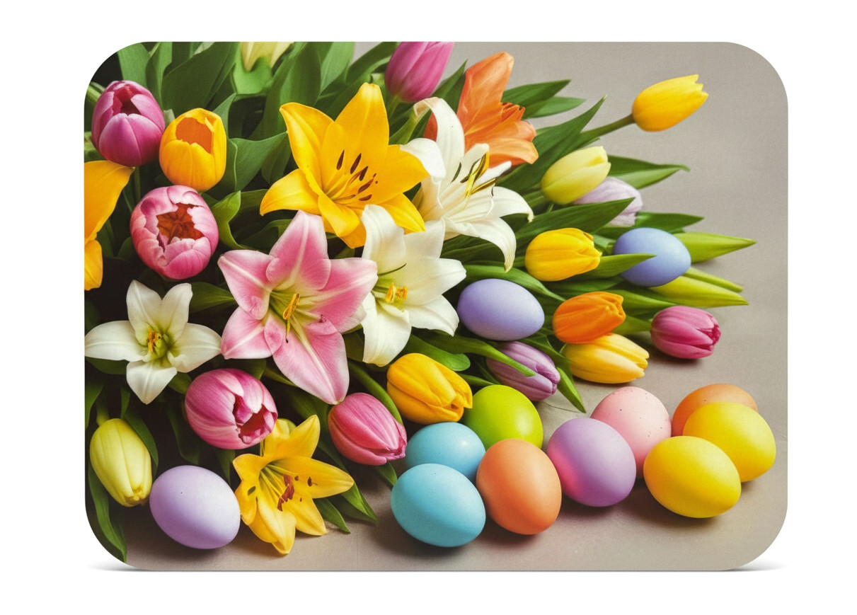 Mata stołowa 40x30 cm KOLOROWE PISANKI, TULIPANY, LILIE NA SZARYM TLE