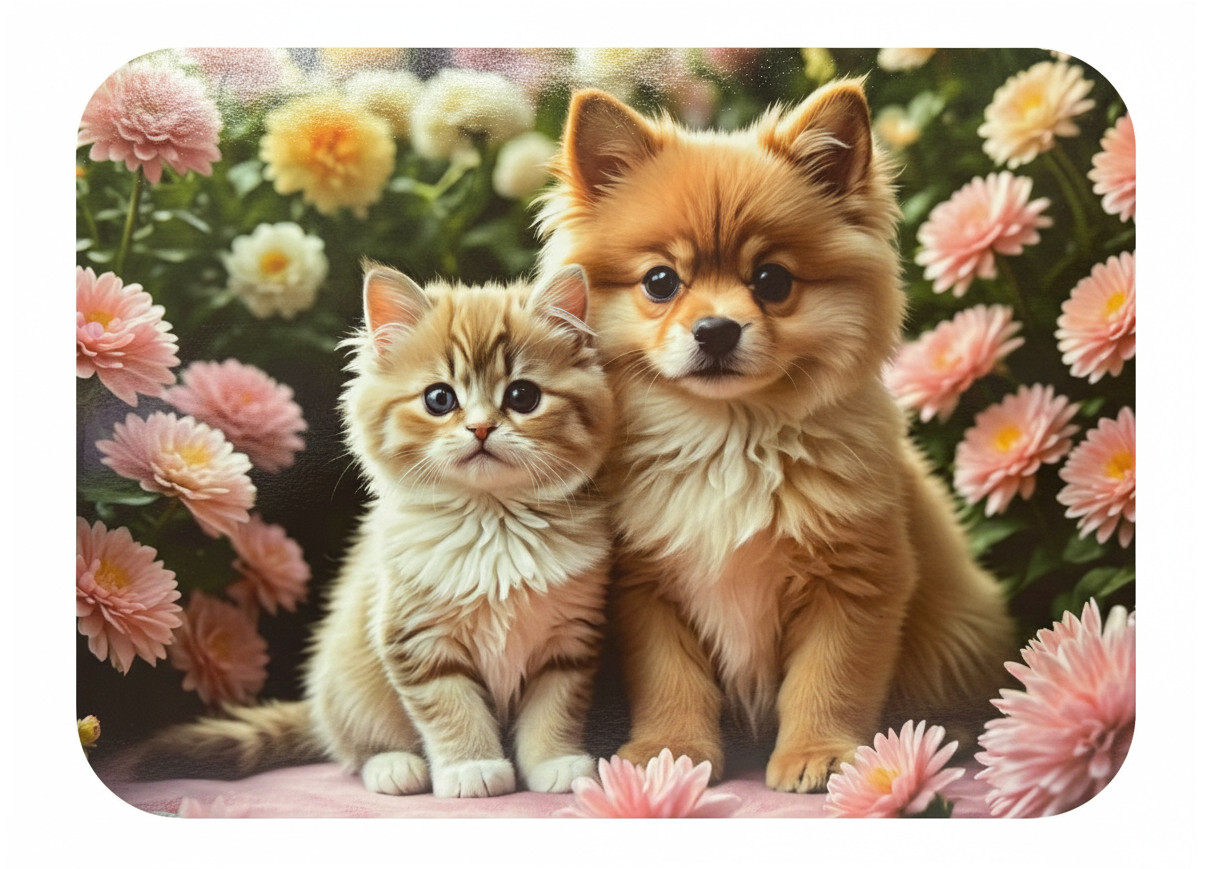 Mata stołowa 40x30 cm KOT Z PSEM NA TLE RÓŻOWEJ GERBERY