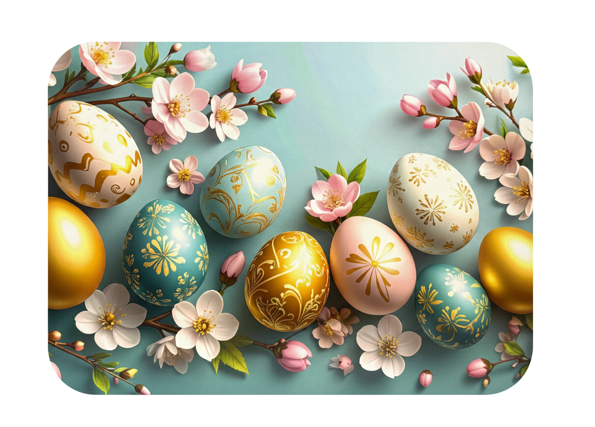 Mata stołowa 40x30 cm PISANKI ZE ZŁOTYM WZOREM I RÓŻOWYM KWIATEM WIŚNI