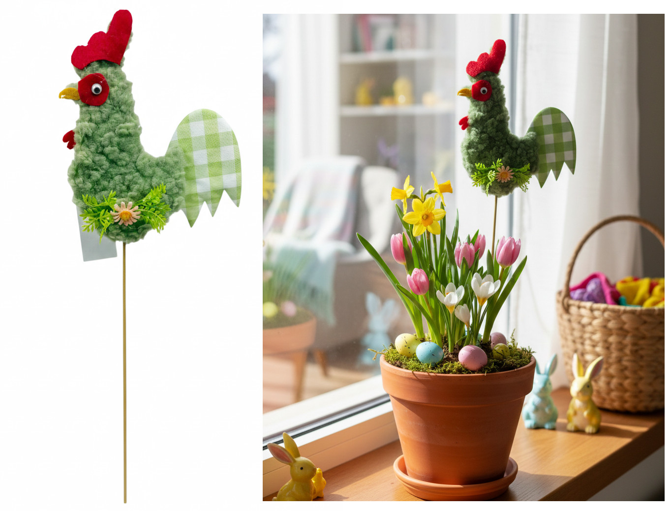Dekoracja wielkanocna KURCZAK z kwiatkami na piku 34x12x6 cm
