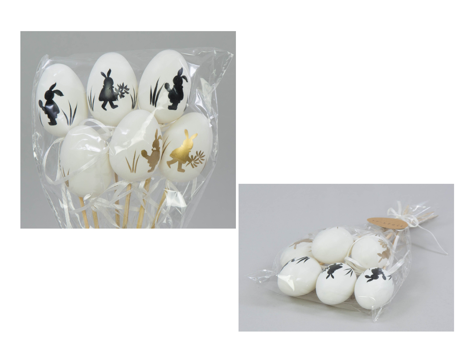 Jajko plastikowe (6 cm) na piku białe z wzorem ZAJĄC 26 cm - kpl 6 szt