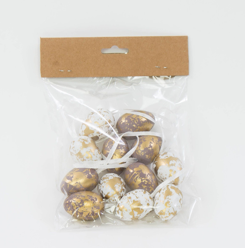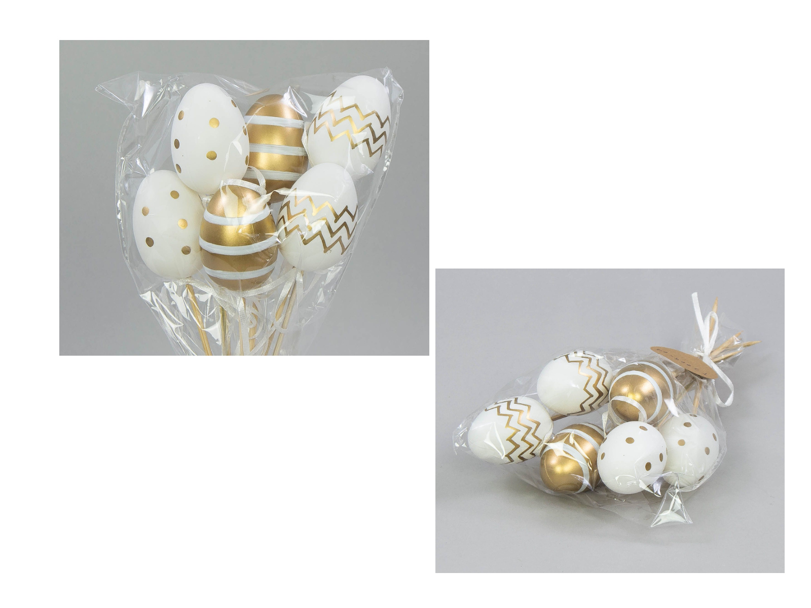Jajko plastikowe (6 cm) na piku białe, złote z wzorem PASKI, KROPKI 26 cm - kpl 6 szt