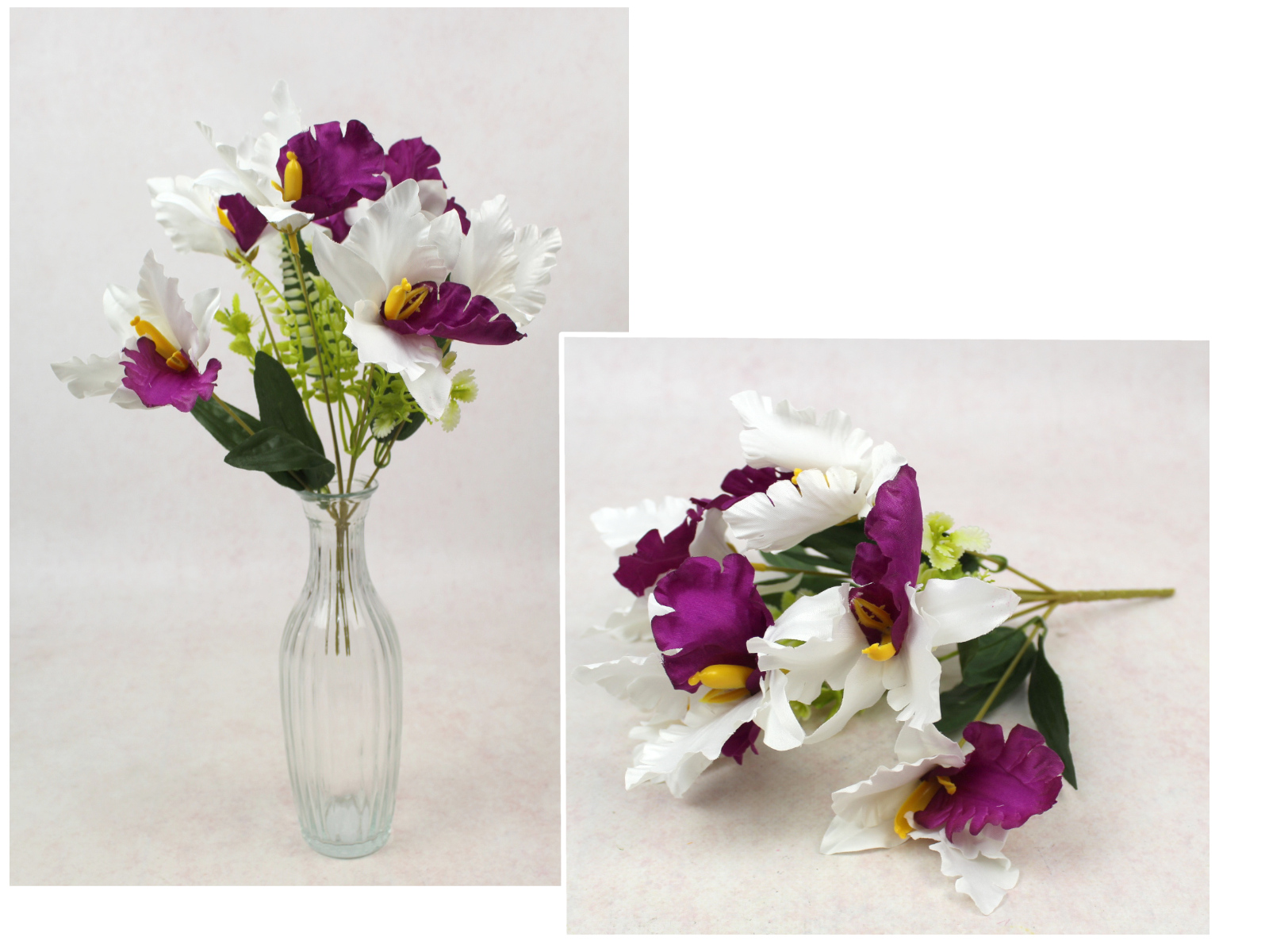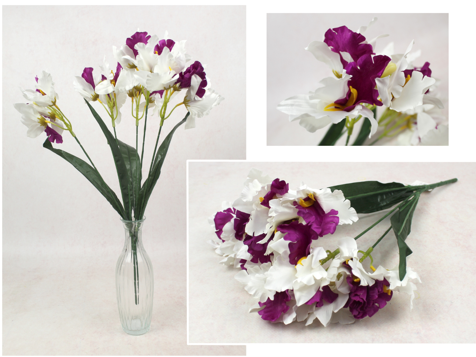 Bukiet IRYS wys. 32 cm, 7 łodyg (7 kwiatów 10x5 cm) biało fioletowy