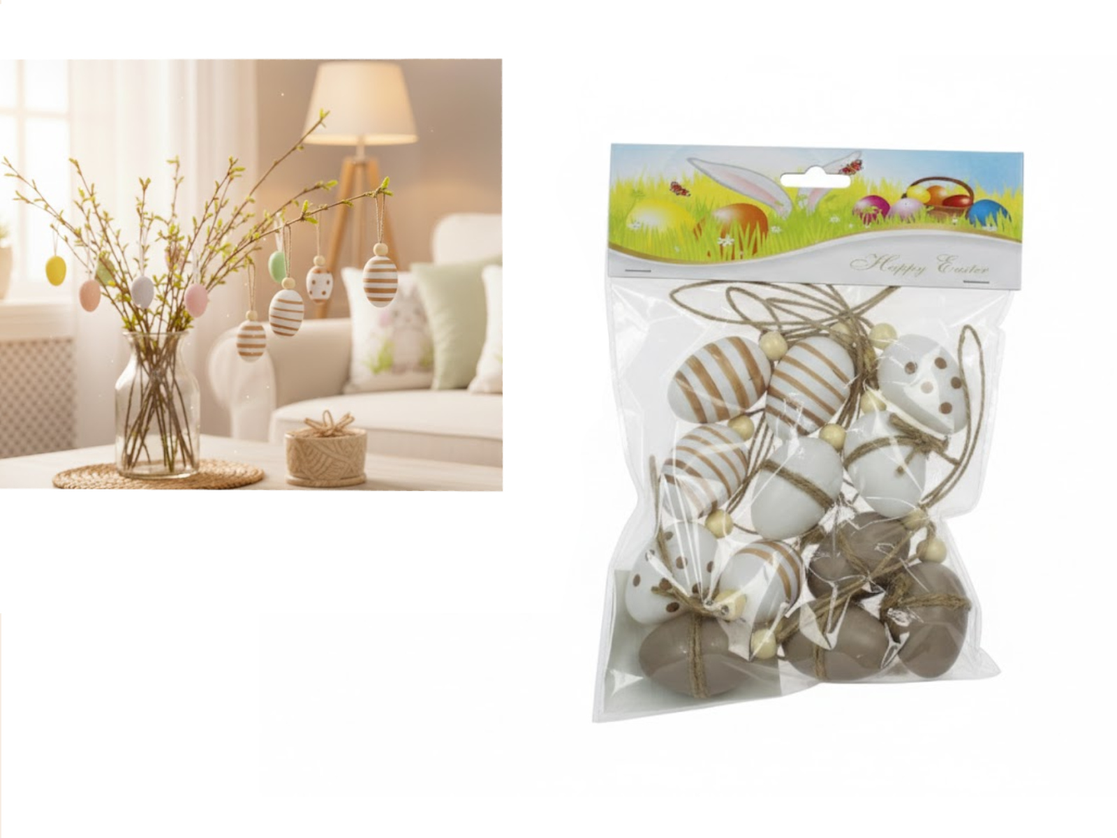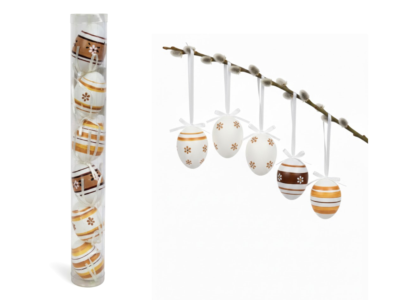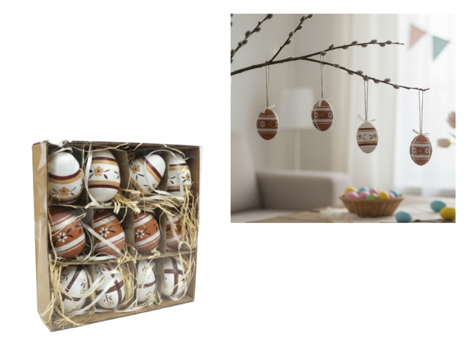 Dekoracja zawieszka wielkanocna JAJKO 6 cm  w kartonie białe, brązowe KWIATY, PASY kpl. 12 szt